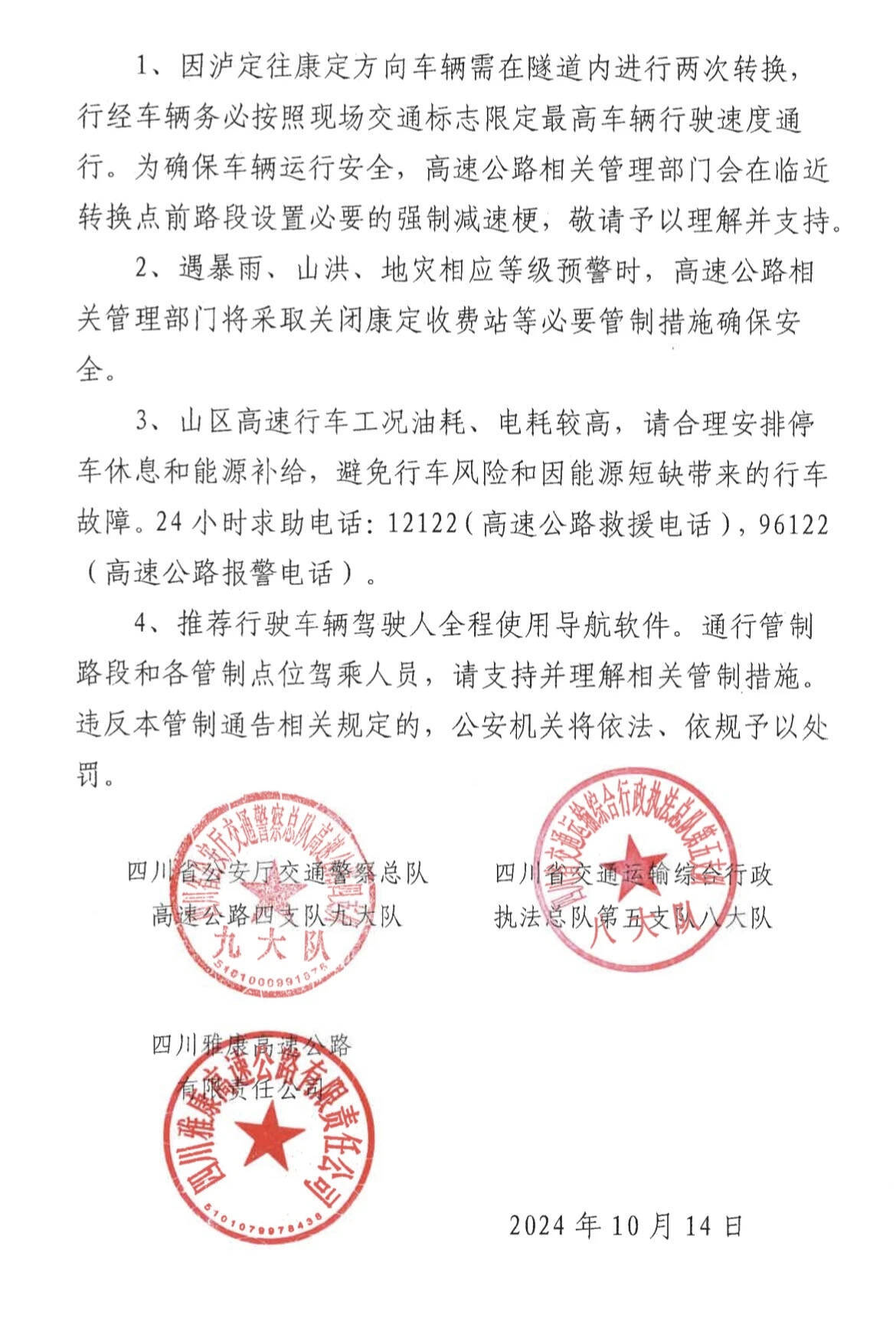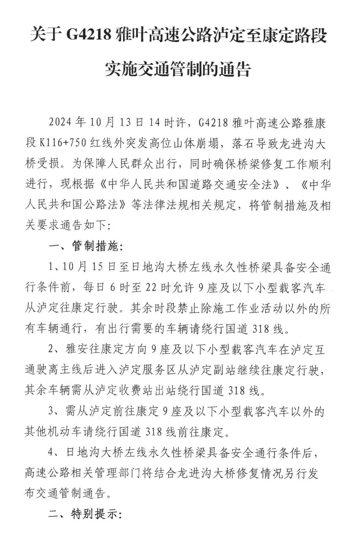 4、日地溝大橋左線永久性橋梁具備安全通行條件后,高速公路相關(guān)管理部門(mén)將結(jié)合龍進(jìn)溝大橋修復(fù)情況另行發(fā)布交通管制通告。