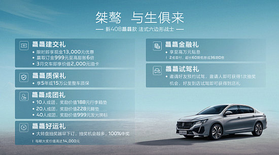 新408龘龘款上市共為客戶提供龘龘建交禮、龘龘金融禮、龘龘質(zhì)保禮、龘龘試駕禮、龘龘成團(tuán)禮、龘龘好運(yùn)禮六大豪華禮遇。