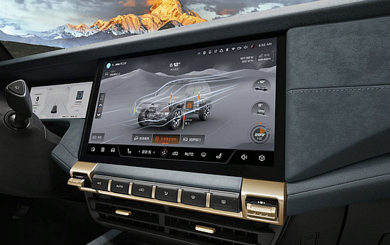 內(nèi)飾方面,屏幕采用內(nèi)嵌式設(shè)計(jì),擁有 14。6 英寸超大屏幕尺寸,更簡(jiǎn)潔牢靠,屏幕下方集成了大部分日常的功能按鍵,物理按鍵操控起來(lái)觸感更真實(shí),更好的彰顯了 G318 科技與硬派合而兼得的特點(diǎn)。