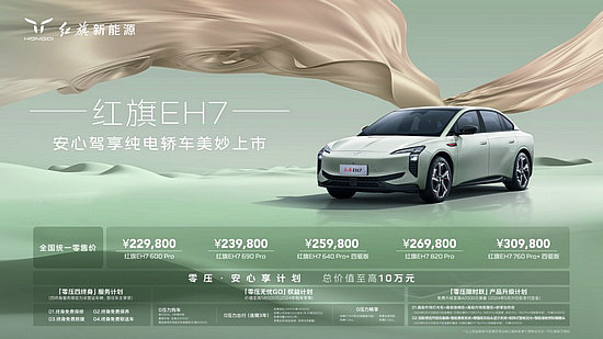 3月20日,紅旗新能源在深圳市民廣場(chǎng)舉行“安心駕享·紅旗EH7上市發(fā)布會(huì)”,紅旗新能源品牌首款戰(zhàn)略車型——“安心駕享純電轎車”紅旗EH7正式發(fā)布,全國統(tǒng)一零售價(jià)為22。98萬-30。98萬元,特別推出的“零壓安心享”計(jì)劃,紅旗EH7用戶最高可享價(jià)值10萬元的權(quán)益。