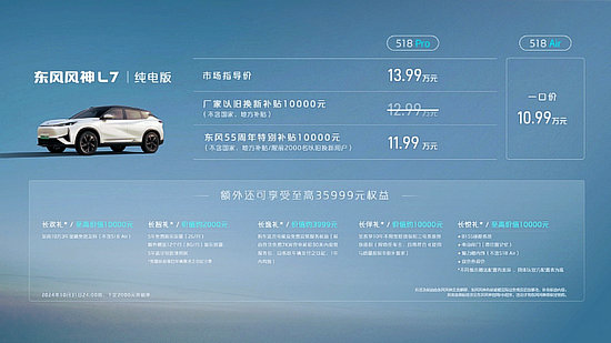 東風(fēng)風(fēng)神L7 EV 518 Pro官方指導(dǎo)價為13。99萬元,綜合補貼后售價11。99萬元起;東風(fēng)風(fēng)神L7 EV 518 Air驚爆一口價10。99萬元。與此同時,新車還帶來了豐厚的福利:2024年10月31日24點前下定2000元并鎖單的用戶,還可額外享受至高價值35999元的五重禮。