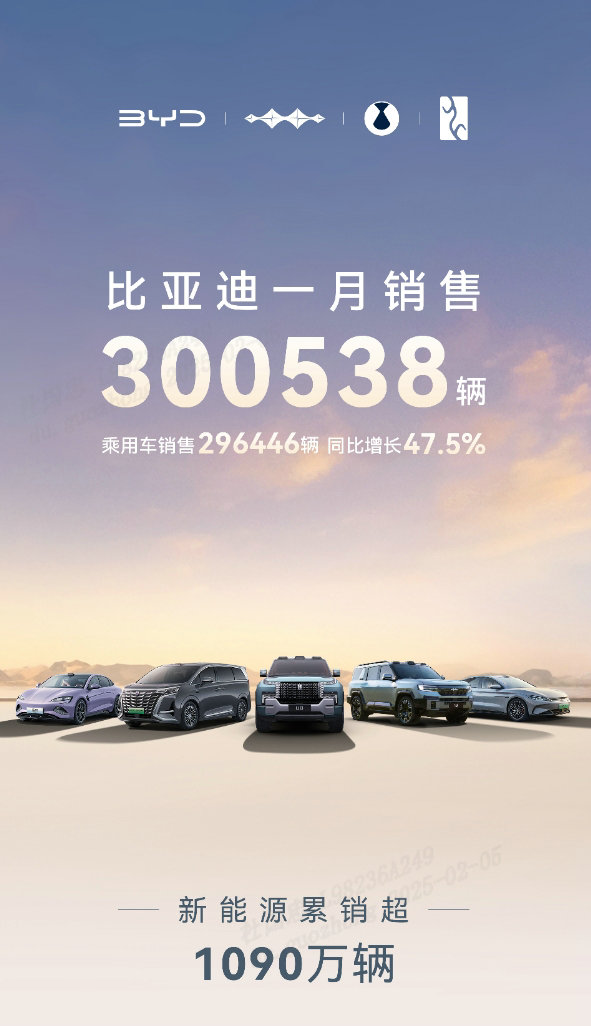 近日,比亞迪公布了最新的銷量數(shù)據(jù),2025年1月收獲了300538輛的銷量成績(jī)。