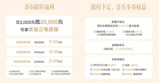 據(jù)悉,2月28日前下定嵐圖知音,用戶還能享受“2000元抵20000元”的福利政策,17.89萬起的價格就能入手。在此基礎(chǔ)上,嵐圖知音官方還推出包括終身三電質(zhì)保的三大購車好禮。同時,還能疊加2025年國補政策。
