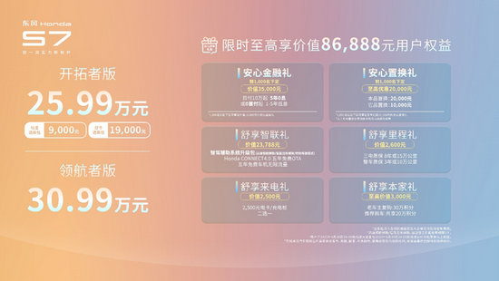為了讓消費(fèi)者購車無壓力,用車無憂慮。東風(fēng)本田S7還帶來力度空前的新車購車政策:全系贈(zèng)送智駕輔助系統(tǒng)升級包,并享有置換、金融、質(zhì)保等豐厚權(quán)益,前1000名下定用戶,至高可享價(jià)值86,888元的購車禮遇。