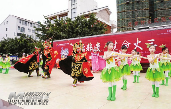 近日,在高新區(qū)火炬第三小學(xué)(以下簡(jiǎn)稱火炬三小)的操場(chǎng)舞臺(tái)上,市教體局正對(duì)該校“非遺”系列工作坊創(chuàng)建“綿陽市優(yōu)秀學(xué)生藝術(shù)社團(tuán)”進(jìn)行現(xiàn)場(chǎng)復(fù)核評(píng)估,由該校戲劇社團(tuán)學(xué)生演出的《桃花村》《薪火相傳》《變臉》等節(jié)目正在接受審評(píng)。孩子們?cè)谂_(tái)上有模有樣的一念一唱,一舉一動(dòng)贏得了操場(chǎng)內(nèi)外過往市民的陣陣喝彩聲、掌聲。