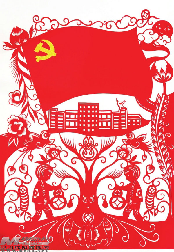 其中,王位的剪紙《勤勞致富幸福家園》以喜鵲、蝙蝠、花朵、麥穗、蘆笙、祥云等為素材進行創(chuàng)作,寓意在中國共產(chǎn)黨的領(lǐng)導(dǎo)下,黃河邊上的人民勤勞建設(shè)美麗家園,過上幸福生活。