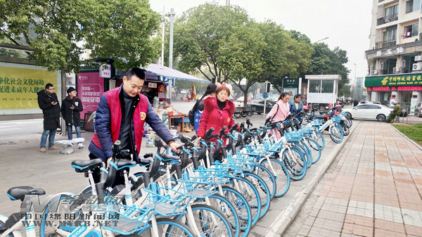 志愿者規(guī)范共享單車停放 (視覺綿陽資料圖片)
