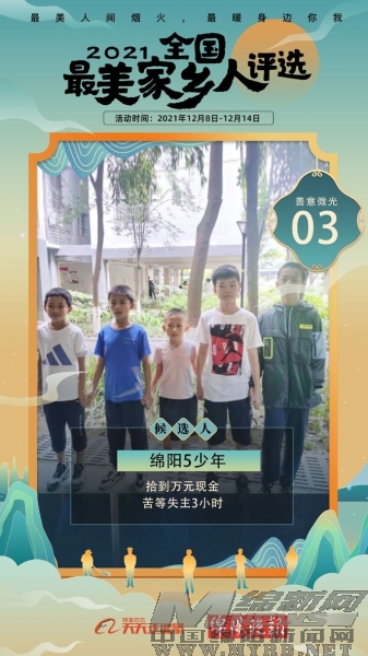 綿陽新聞網(wǎng)訊 12月8日,記者從全國“最美家鄉(xiāng)人”評選組委會了解到,2021全國“最美家鄉(xiāng)人”評選已于今日正式開啟,網(wǎng)絡投票通道同步開通。經(jīng)過本報與阿里巴巴天天正能量共同評估,綿陽的王楊梅和戴一攀等5位同學的最美故事進入全國“最美家鄉(xiāng)人”候選。