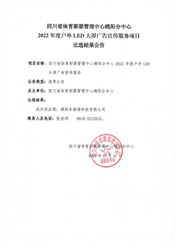 四川省體育彩票管理中心綿陽分中心2022年度戶外LED大屏廣告宣傳服務(wù)項(xiàng)目比選結(jié)果公告