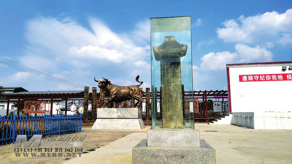 在小橋村廣場另一側(cè),一塊被玻璃保護(hù)起來的方形石碑和旁邊豎立的金色牛王非常引人注目,這座石碑就是“牛王祀田碑記”。這塊石碑過去深埋地下,2007年在進(jìn)行廣場施工時才被發(fā)現(xiàn),從此,二百多年前當(dāng)?shù)丶漓肱M醯膫鹘y(tǒng)民俗活動被后人所知,并延續(xù)了下來。