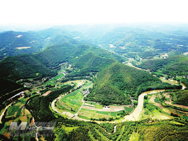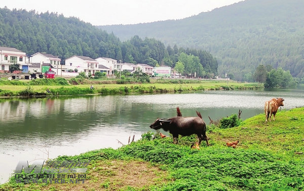 在松柏村,清澈的彌江流經(jīng)整個(gè)村莊,江畔的山上松林密布,牛兒在河邊悠閑地吃草。彌江邊立有一塊牌,標(biāo)注著這是縣級(jí)濕地保護(hù)區(qū)。沿著河岸向上游前行,河流彎彎曲曲地在山巒間蜿蜒,一派寧?kù)o的鄉(xiāng)村景象。