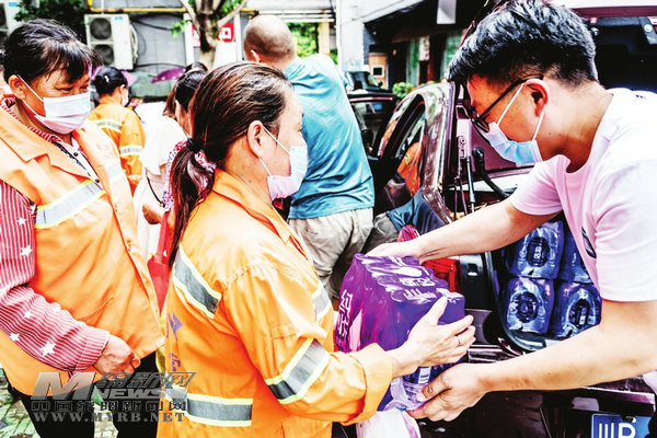 志愿者將準(zhǔn)備好的礦泉水、毛巾、花露水、藿香正氣水等各類物資,送到了環(huán)衛(wèi)工手上,并向他們表達(dá)真誠的敬意,叮囑他們?cè)谘谉岬南娜?,一定要注意防暑降溫?/p>
