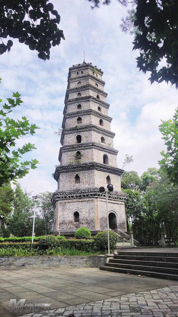 東塔建造于明代萬歷年間,塔坐西北向東南,為九級六邊密檐閣樓式磚石塔。塔通高24米,塔基高1.3米,底層邊長4米,首層不計檐高2.8米,底層各角嵌石柱,正面石柱上書明代潼川(今三臺)知府陳南金塔聯(lián):“九級浮屠,舉步凌云霄以上;三巴砥柱,陶情在山水之間。”塔頂有七律詩殘句:“青春結(jié)客上東山,千里江城一望間。”清代道光年間貢生陳謙記:“塔勢插煙霄,登臨眼界超。河流盤地闊,山色壓城遙。”清張智瑩記:“塔高鈴共語,月朗磐同催。”