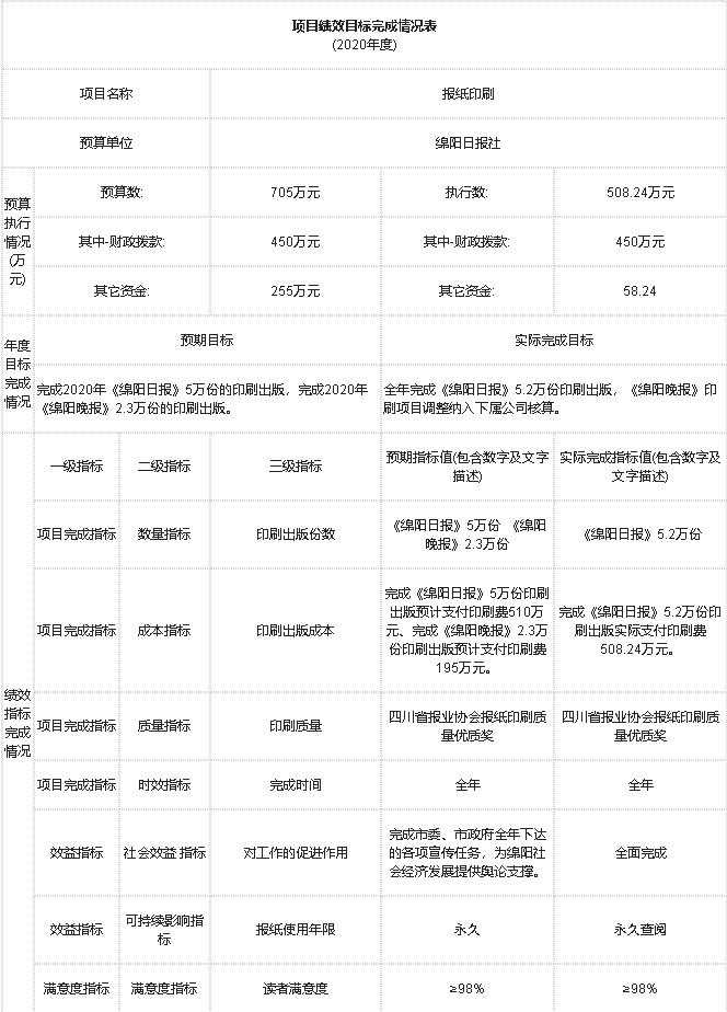 2020年部門對(duì)“報(bào)紙印刷”、“報(bào)紙發(fā)行”、“《綿陽(yáng)政事》《綿陽(yáng)發(fā)布》工作經(jīng)費(fèi)”等項(xiàng)目進(jìn)行了績(jī)效自評(píng),將評(píng)價(jià)結(jié)果應(yīng)用到次年的項(xiàng)目預(yù)算申報(bào)及項(xiàng)目績(jī)效管理中,從運(yùn)行成本、管理效率等方面,衡量報(bào)社核心項(xiàng)目的實(shí)施效果。并按規(guī)定時(shí)限在門戶網(wǎng)站及時(shí)公開(kāi)了項(xiàng)目支出績(jī)效自評(píng)報(bào)告。