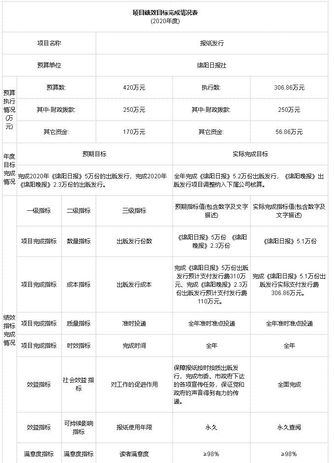 項(xiàng)目完成指標(biāo):截止2020年12月31日保質(zhì)保量按時(shí)完成了《綿陽(yáng)日?qǐng)?bào)》2020年5.1萬(wàn)份的報(bào)紙發(fā)行任務(wù)。