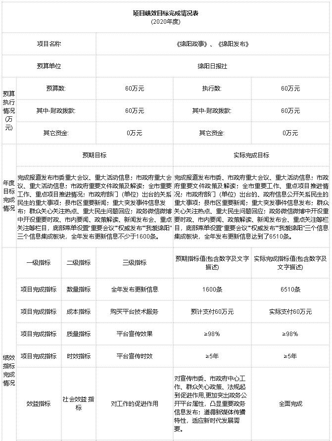 1-1-2.績(jī)效目標(biāo)制定情況:自評(píng)得分5分。2020年度完成“報(bào)紙印刷”、“報(bào)紙發(fā)行”、“綿陽(yáng)政事”、“多媒體電子閱報(bào)欄二期”、“融媒體大數(shù)據(jù)中心”等5個(gè)項(xiàng)目,相關(guān)項(xiàng)目績(jī)效目標(biāo)要素編制完整,各項(xiàng)指標(biāo)均細(xì)化量化。