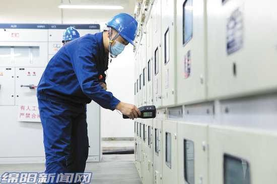 綿陽供電公司巡查人員在九洲體育館配電室檢查配電設(shè)施運行狀態(tài)