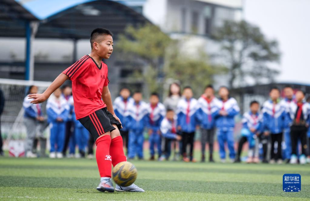 在貴州省丹寨縣城關(guān)第一小學(xué),金粲璨(前)參加足球基本功訓(xùn)練(11月15日攝)。