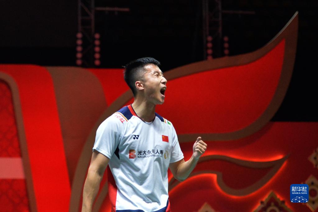 當(dāng)日,在泰國曼谷舉行的2022世界羽聯(lián)世界巡回賽總決賽男單A組小組賽中,中國選手陸光祖以2比1戰(zhàn)勝印度選手普蘭諾伊。陸光祖在比賽中慶祝。新華社發(fā)(拉亨攝)