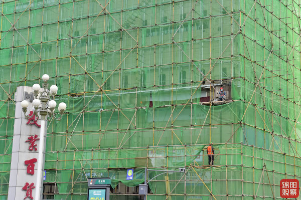 ↑12月18日,公園路,工人對(duì)建筑外墻進(jìn)行裝修升級(jí)。
