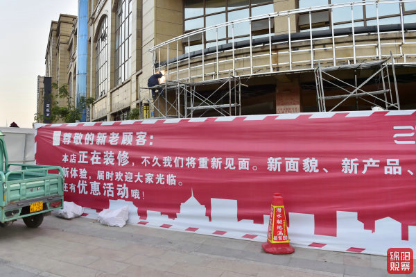 ↑12月18日,城區(qū)天津橋一側(cè),裝修中的門面上掛上了大紅布。