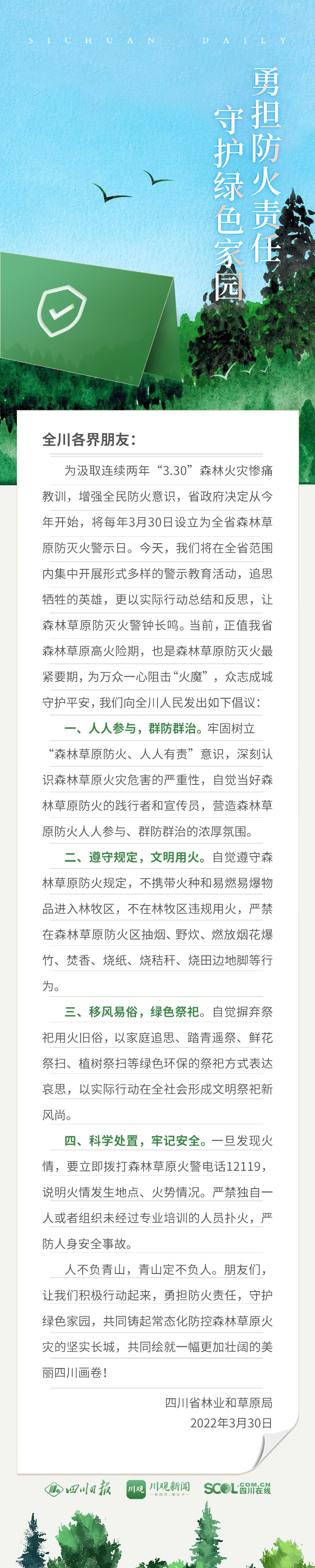 “自覺(jué)遵守森林草原防火規(guī)定,不攜帶火種和易燃易爆物品進(jìn)入林牧區(qū),不在林牧區(qū)違規(guī)用火。自覺(jué)摒棄祭祀用火舊俗,以家庭追思、踏青遙祭、鮮花祭掃、植樹(shù)祭掃等綠色環(huán)保的祭祀方式表達(dá)哀思……”今天,四川省林業(yè)和草原局發(fā)出倡議:讓我們積極行動(dòng)起來(lái),勇?lián)阑鹭?zé)任,守護(hù)綠色家園,共同鑄起常態(tài)化防控森林草原火災(zāi)的堅(jiān)實(shí)長(zhǎng)城,共同繪就一幅更加壯闊的美麗四川畫(huà)卷!