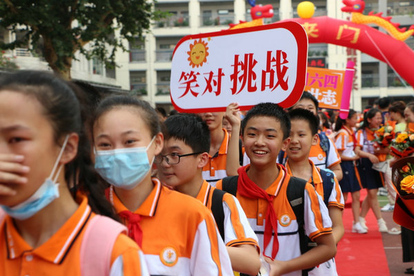 下午17:00許,畢業(yè)典禮開始。學(xué)生為老師們獻(xiàn)上鮮花,老師為學(xué)生們頒發(fā)畢業(yè)證。“六一六一,自強(qiáng)不息!”“六二六二,獨(dú)一無二!”……各班學(xué)生們喊著口號(hào),有序走過“未來門”,和老師做最后的告別。一些學(xué)生和恩師互相擁抱,揮淚告別。
