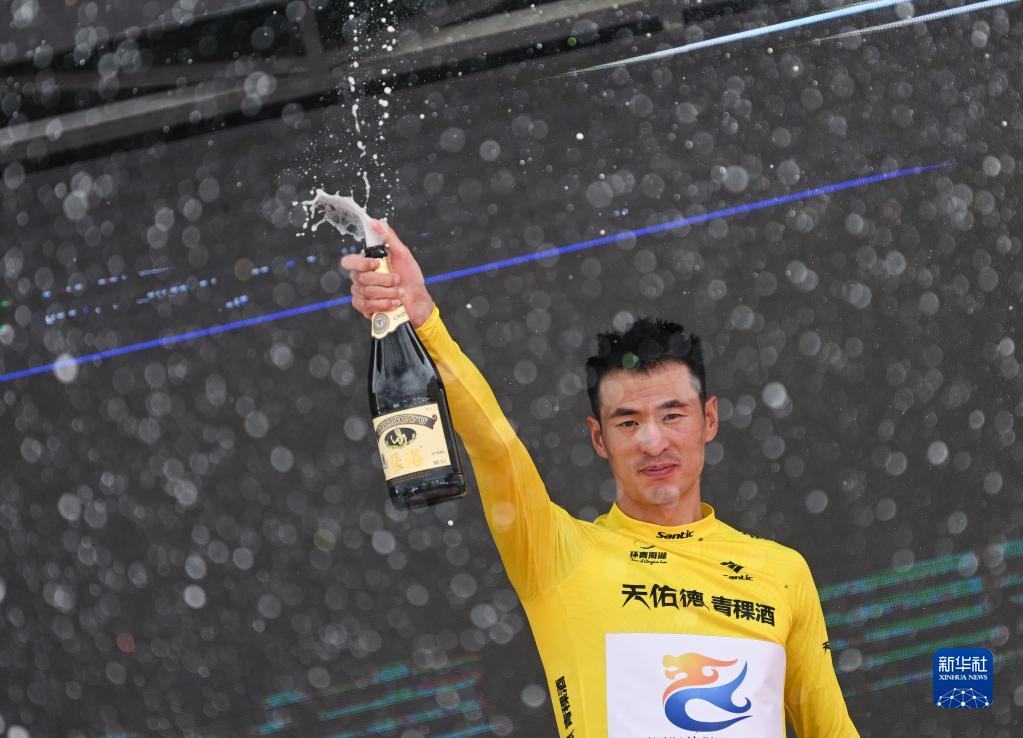 7月31日,平潭國際旅游島洲際隊(duì)選手劉建坤身著代表個(gè)人總成績第一名的黃色領(lǐng)騎衫在領(lǐng)獎臺上慶祝。