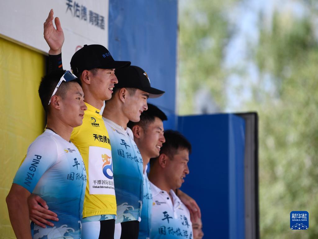 8月3日,劉建坤(左二)身著代表個人總成績第一名的黃色領騎衫在領獎臺上與隊友合影。新華社記者張龍攝