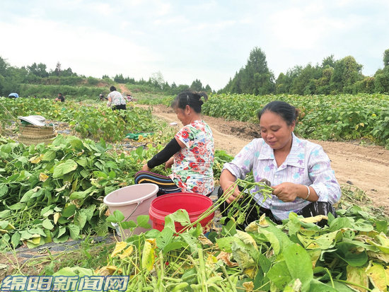 綿陽新聞網(wǎng)訊   近日,在三臺縣西平鎮(zhèn)紅梁村一片綠意盎然的田地里,隨處可見村民采摘、搬運(yùn)大豆忙碌的身影,一幅幅多彩的豐收畫卷在這里展開。高聳的玉米還為村民們形成天然的遮陽傘,大家抓緊時(shí)間搶收。
