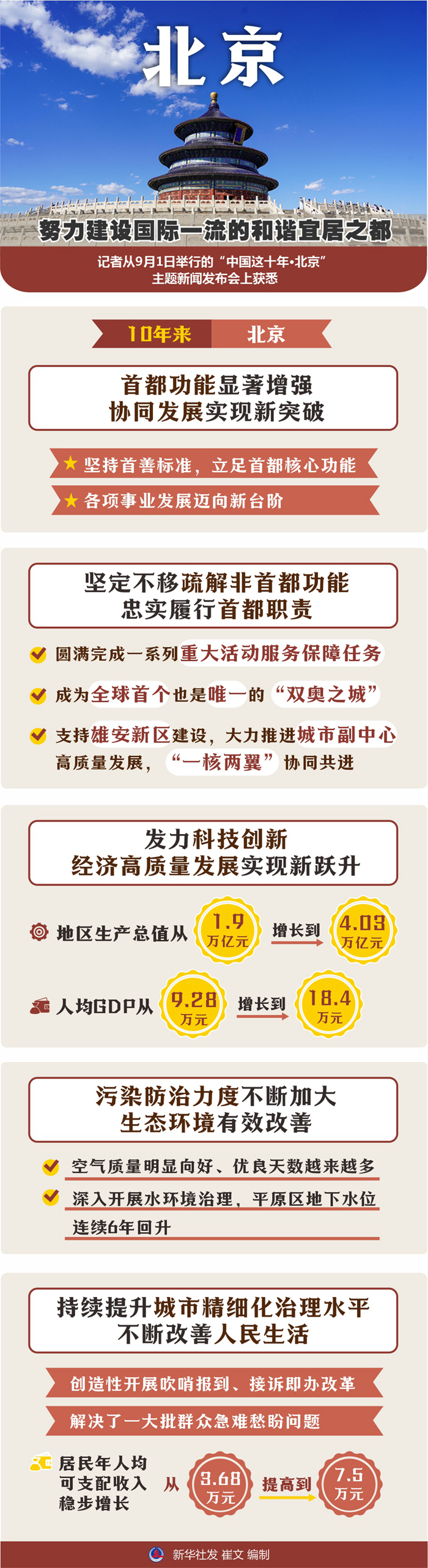 新華社北京9月1日電(記者王君璐)記者從1日舉行的“中國這十年·北京”主題新聞發(fā)布會上獲悉,黨的十八大以來,北京深入貫徹落實習近平總書記重要指示精神,全市上下牢記囑托、勇?lián)姑?,全面貫徹新發(fā)展理念,融入新發(fā)展格局,求真務實、砥礪奮進,努力建設國際一流的和諧宜居之都,在全面建設社會主義現(xiàn)代化國家新征程上奮力譜寫首都發(fā)展新篇章。