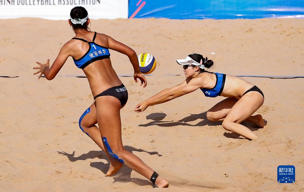 9月1日,新疆旺源一隊(duì)選手卜怡婷(右)/迪麗娜爾在比賽中救球。最終,在女子組第一階段比賽中,新疆旺源一隊(duì)選手卜怡婷/迪麗娜爾以0比2不敵山東隊(duì)選手王穎芃/張新晨。新華社記者 楊植森 攝