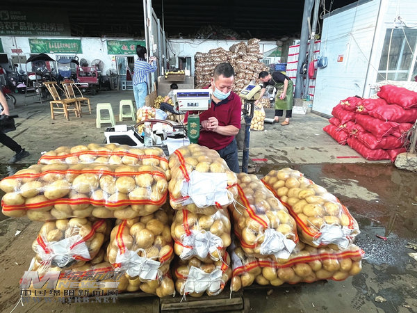 下午4時,高水農(nóng)副產(chǎn)品批發(fā)市場依然很熱鬧,運送蔬菜的車輛來回穿梭,購菜的市民忙著挑選,商家忙著打包裝車,土豆、南瓜、冬瓜、辣椒、大蔥等各類蔬菜品類齊全、貨源充足、價格穩(wěn)定。