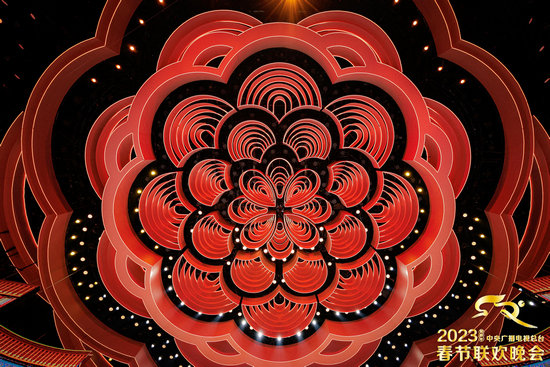 2023年春晚舞美設(shè)計體現(xiàn)“滿庭芳”的理念,取意自中國古典文學(xué)詞牌名,通過演播大廳多個方位的設(shè)計,共同營造祈愿圓“滿”的中華大家“庭”盡展“芳”華的主題氣象。其中,由四瓣花結(jié)構(gòu)演化重構(gòu)而成的演播廳頂部藝術(shù)裝置,既是根植于中華文明的美學(xué)創(chuàng)造,又是綻放著現(xiàn)代設(shè)計理念的創(chuàng)新呈現(xiàn)。創(chuàng)意取材自距今6000年至4800年前的廟底溝彩陶標(biāo)志性的“花瓣紋”,著名考古學(xué)家蘇秉琦先生曾提出:花卉圖案彩陶,可能就是華族(即華夏民族)得名的由來。