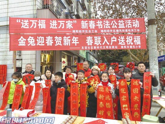 1月14日,友誼社區(qū)聯(lián)手塘汛小學(xué)開(kāi)展“金兔迎春賀新年春聯(lián)入戶(hù)送祝福”活動(dòng),把濃濃的年味和新春的祝福送給轄區(qū)居民。活動(dòng)中,塘汛小學(xué)的老師、學(xué)生們揮毫潑墨,一張張力透紙背的“福”字和一副副對(duì)仗工整、寓意吉祥的春聯(lián),帶著濃濃的墨香,洋溢著新春的喜氣,志愿者們幫忙將寓意吉祥的春聯(lián)和“福”字送到居民手中,大家臉上洋溢著喜悅的笑容。