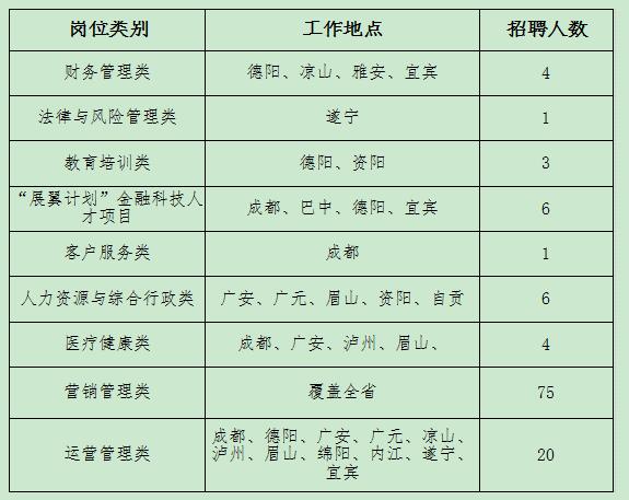 四川省公司省本部及下轄機(jī)構(gòu)共計擬招聘120人,崗位涵蓋“展翼計劃”銷售管理人才項目、“展翼計劃”金融科技人才項目、營銷管理類、醫(yī)療健康類、運(yùn)營管理類、財務(wù)管理類、客戶服務(wù)類、法律與風(fēng)險管理類、教育培訓(xùn)類、人力資源與綜合行政類等各類崗位,工作地點覆蓋全省。