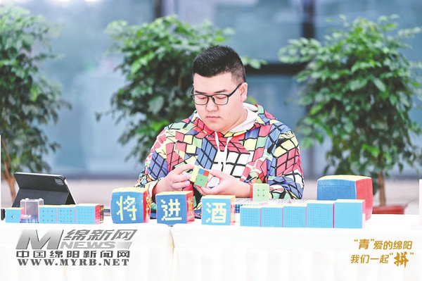綿陽新聞網(wǎng)訊 近日,綿陽原創(chuàng)音樂劇《將進(jìn)酒》首演的第二天,“‘青’愛的綿陽,我們一起‘拼’”系列活動在科技城人才公園展開,綿陽魔方達(dá)人張濤在現(xiàn)場轉(zhuǎn)動魔方,拼創(chuàng)完成音樂劇中的李白劇照形象。