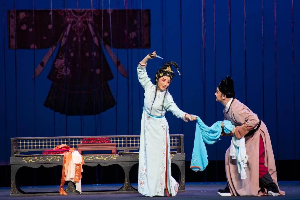 10月16日,湖北省戲曲藝術(shù)劇院的演員在表演黃梅戲《舞衣裳》。新華社發(fā)(杜子璇攝)