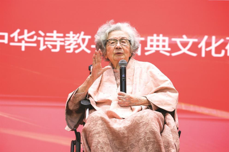 百歲葉嘉瑩分享了她新寫的詩:中華詩教播瀛寰,李杜高峰許共攀。喜見舊邦新氣象,要揮彩筆寫江山。她進(jìn)一步闡釋:“中華詩教要流播、要傳達(dá)給下一代,做出像李白、杜甫他們那樣偉大的成就。我們年輕人,要共同地向著這樣的高山去攀登。”“我們中國是一個(gè)古老、強(qiáng)大的國家,新生的氣象,新興起的事業(yè)都是非常輝煌的,非常遠(yuǎn)大的。我們江山的美好是書寫不完的。我們大家要努力,一起使我們的國家、我們的江山更加美麗,希望我們的前途更加遠(yuǎn)大。”