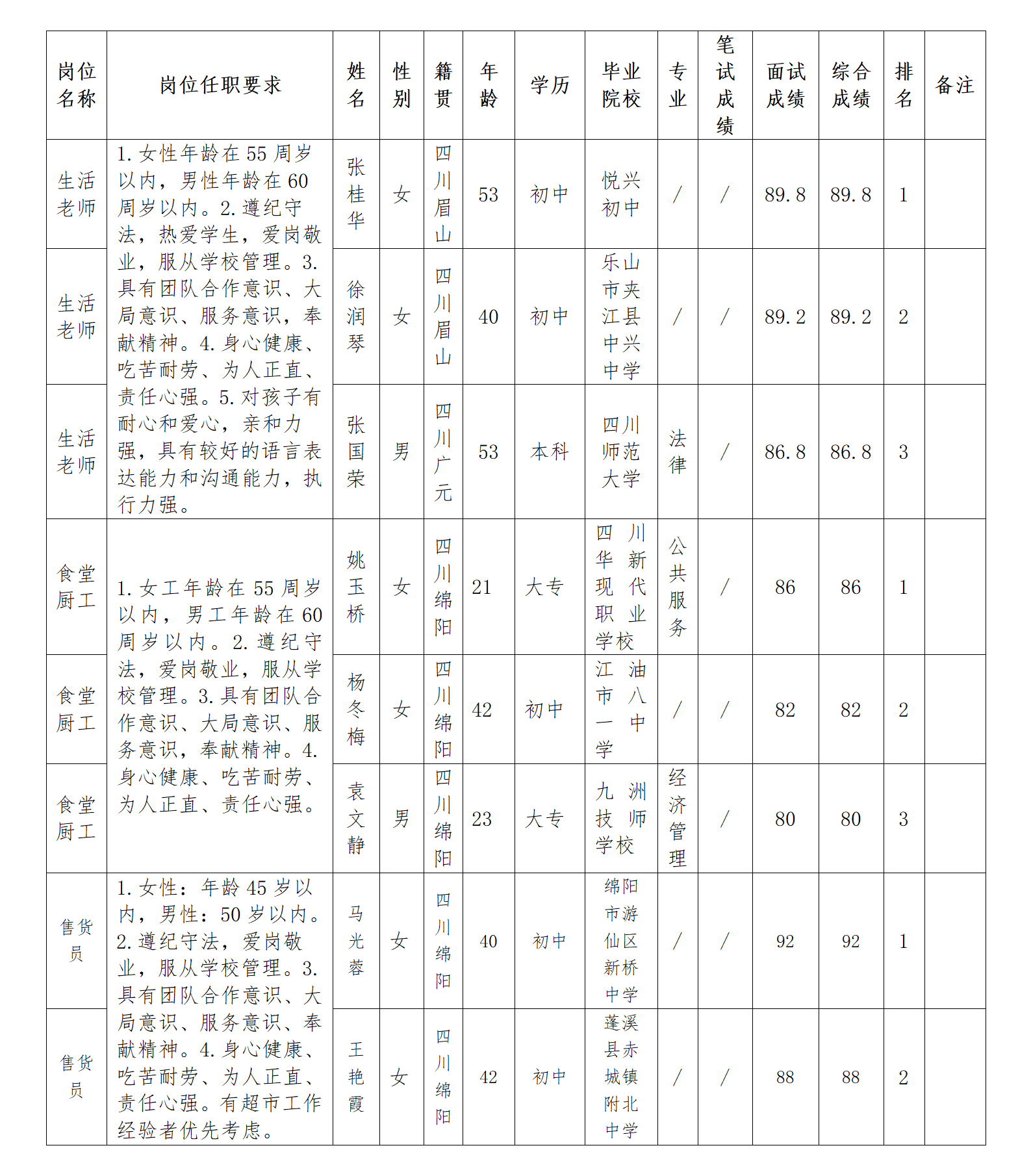 根據(jù)綿陽南山中學(xué)實(shí)驗(yàn)學(xué)校發(fā)布的招聘公告及招聘相關(guān)規(guī)定,經(jīng)面試等程序,現(xiàn)將成績(jī)予以公示。