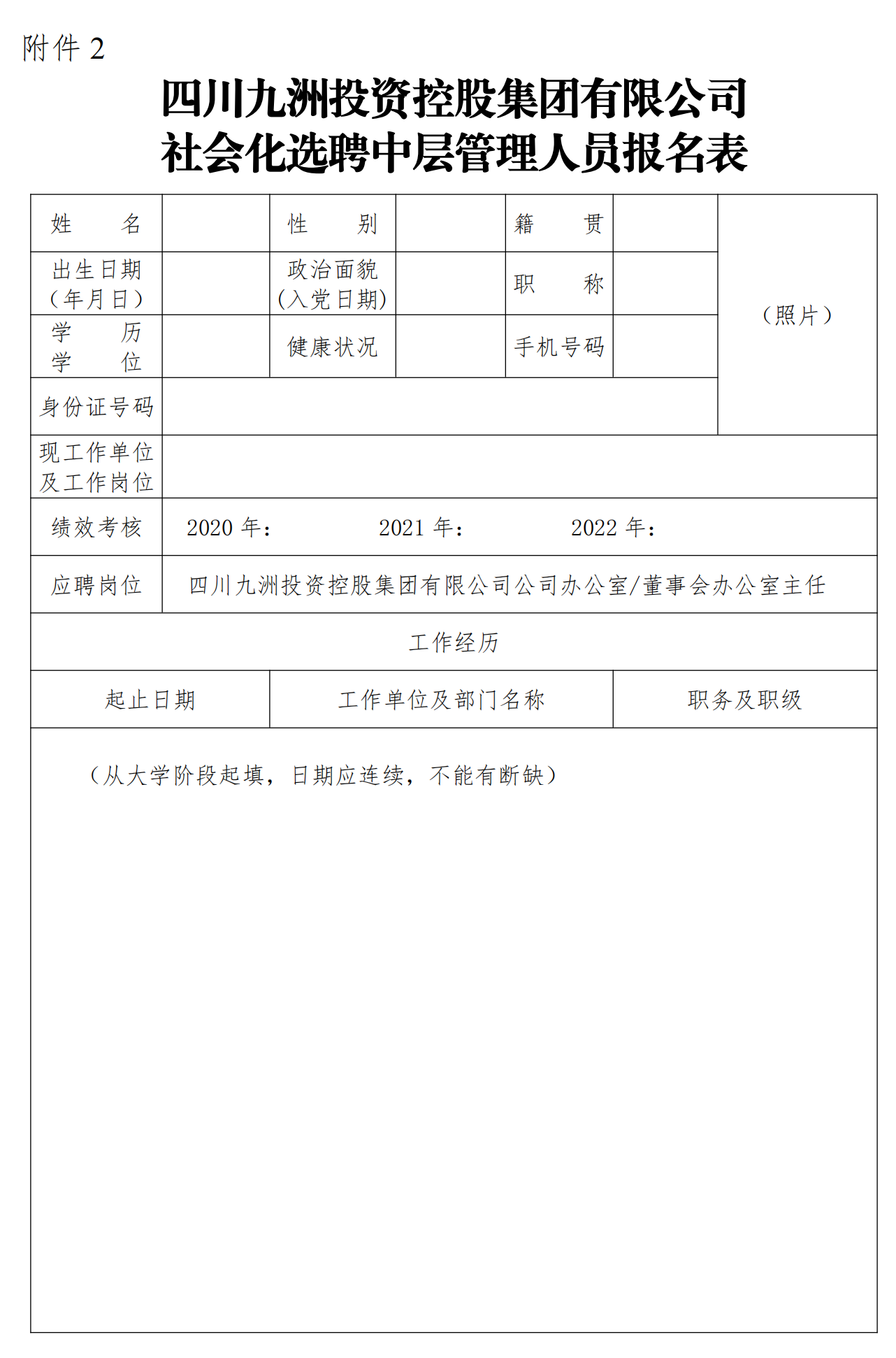 四川九洲投資控股集團(tuán)有限公司(以下簡(jiǎn)稱“九洲集團(tuán)” )公司辦公室/董事會(huì)辦公室主任 1 名。選聘職位的崗位職責(zé)詳見(jiàn)附件 1。九洲集團(tuán)情況詳見(jiàn)官網(wǎng) http://jiuzhou.com.cn/