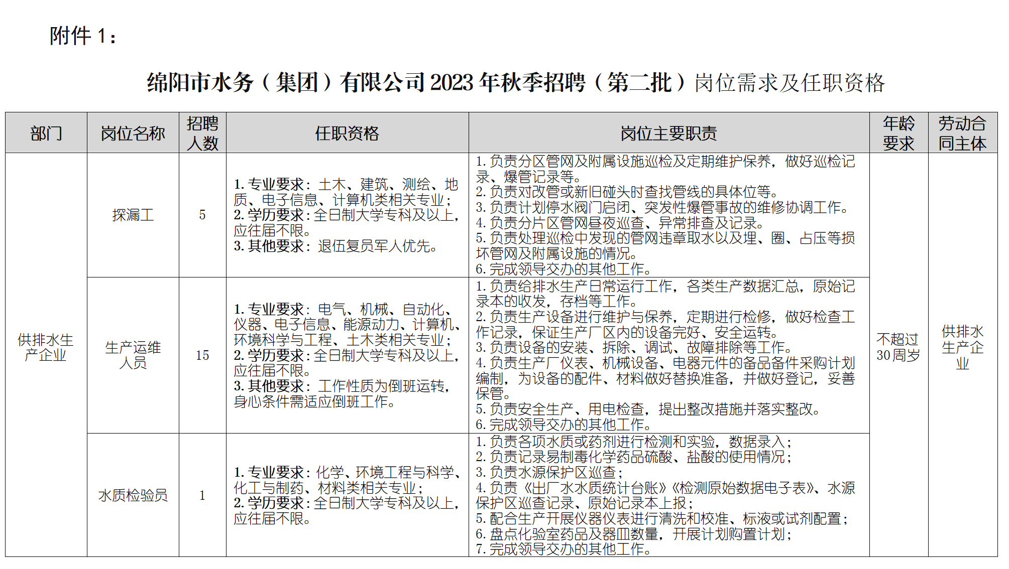1.供排水公司:探漏工5名、生產(chǎn)運(yùn)維人員15名、水質(zhì)檢測員1名。