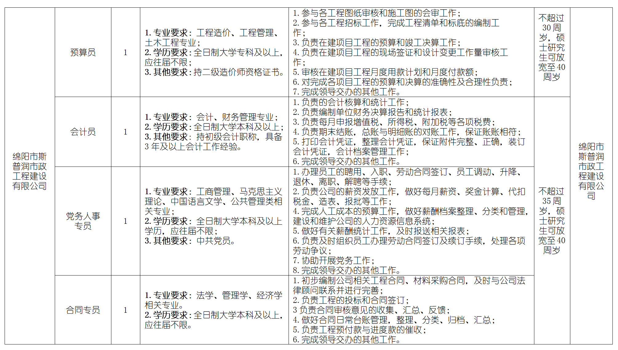 2.綿陽市斯普潤市政工程建設(shè)有限公司:預(yù)算員1名、會計(jì)1名、黨務(wù)人事專員1名、合同專員1名、施工員崗1名。