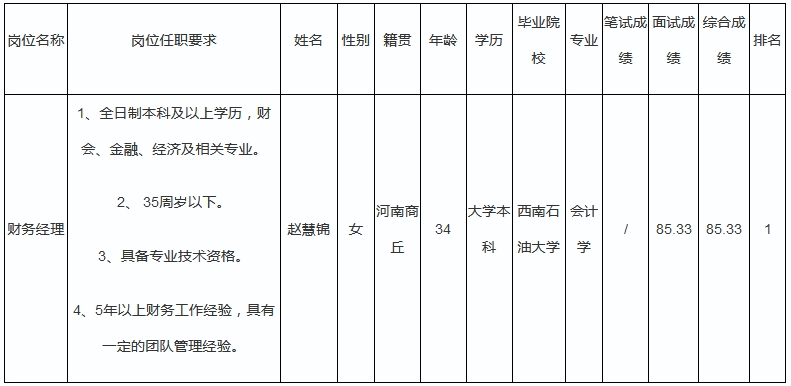 根據(jù)成都長(zhǎng)虹融資租賃有限責(zé)任公司發(fā)布的招聘公告及招聘相關(guān)規(guī)定,經(jīng)筆試、面試等程序,現(xiàn)將面試成績(jī)予以公示。
