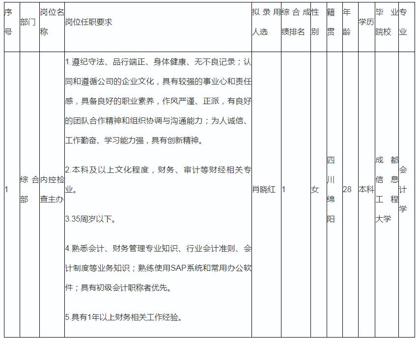 根據(jù)股份財(cái)務(wù)云中心發(fā)布的招聘公告及招聘相關(guān)規(guī)定,經(jīng)面試、考察、體檢等程序,擬錄用肖曉紅同志到股份財(cái)務(wù)云中心綜合部?jī)?nèi)控組工作,現(xiàn)予以公示,具體情況如下: