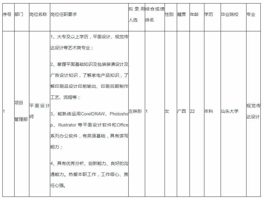 根據廣東長虹電子有限公司發(fā)布的招聘公告及招聘相關規(guī)定,經面試、考察、體檢等程序,擬錄用左映彤同志到項目管理部工作,現予以公示,具體情況如下: