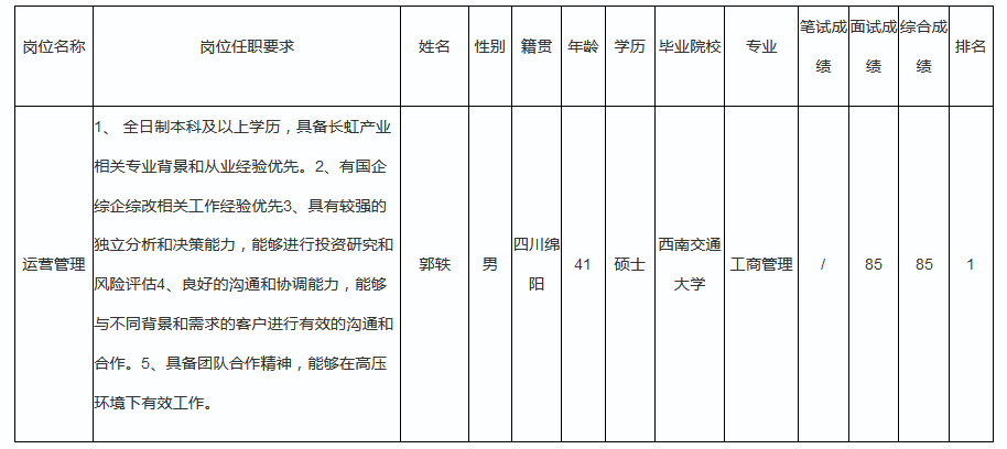 根據(jù)四川長虹網(wǎng)絡(luò)科技有限責任公司發(fā)布的招聘公告及招聘相關(guān)規(guī)定,經(jīng)筆試、面試等程序,現(xiàn)將筆試(面試)成績予以公示。