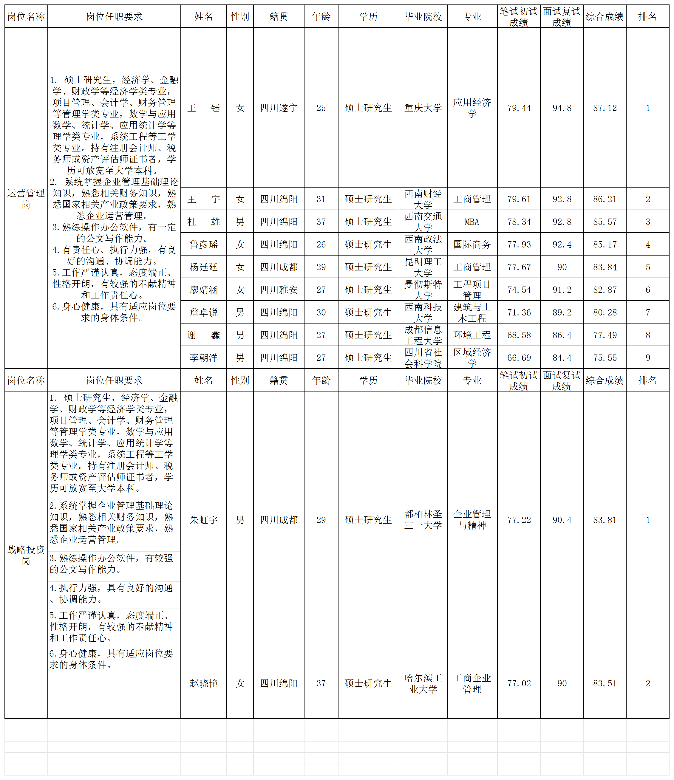 根據(jù)綿陽市投資控股(集團(tuán))有限公司發(fā)布的招聘資本運營中心運營管理崗、戰(zhàn)略投資崗的公告及招聘相關(guān)規(guī)定,經(jīng)筆試初試、面試復(fù)試相關(guān)程序,現(xiàn)將初試綜合成績予以公示。
