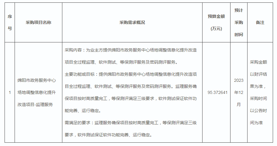 為便于供應商及時了解政府采購信息,根據《四川省財政廳關于開展政府采購意向公開工作的通知》(川財采〔2021〕153號)要求,現將綿陽市政務服務監(jiān)督管理局2023年度(第7批)采購意向公開如下: