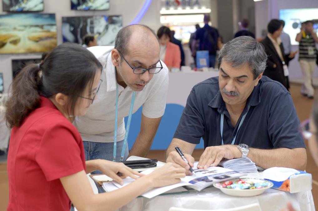 10月15日,阿根廷客商在廣交會上參觀、洽談。新華社記者 盧漢欣 攝